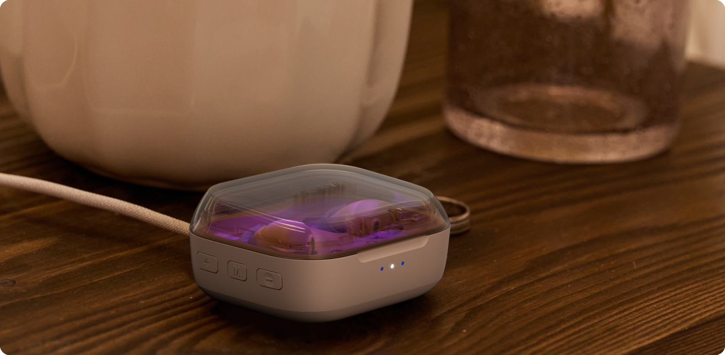 充電ケースに内蔵されたUVライトが、99.9%の菌を効果的に除去。